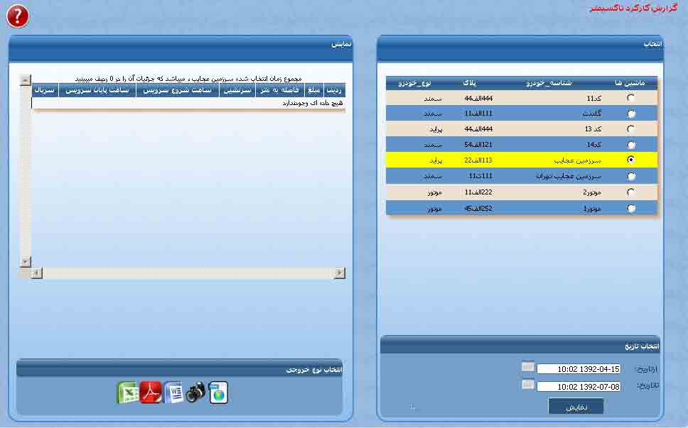 این گزارش مسافت طی شده و میزان مصرف سوخت ماشین را در بازه زمانی خاص نمایش می دهد . توجه داشته باشید که برای گرفتن خروجی صحیح مقادیر وارد شده میزان مصرف سوخت ماشین در قسمت مشخصات راننده درست وارد شده باشد.