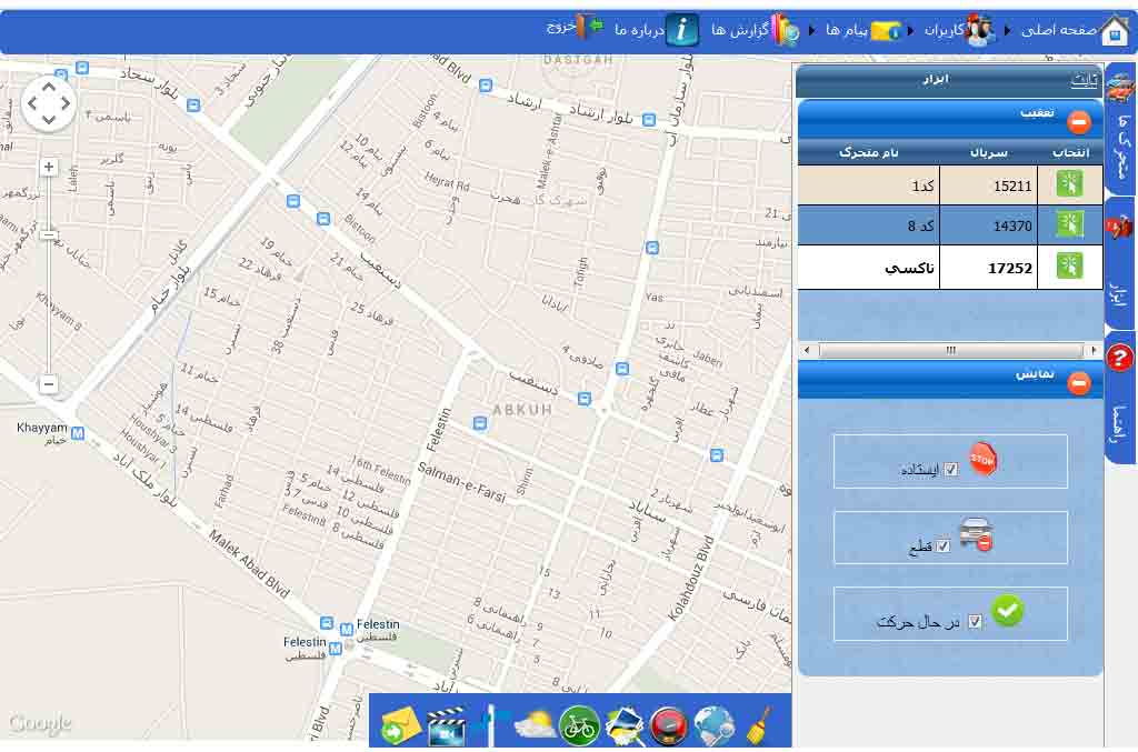 در بخش تعقیب لیست ماشین های موجود نمایش داده می شود که با کلیک بر روی هر کدام صفحه تعقیب باز و می توان مسیر حرکت دستگاه انتخاب شده را به صورت آنلاین بر روی نقشه مشاهده کرد. همچنین در بخش نمایش می توان دستگاه ها را بر اساس قطع یا وصل بودن و یا در حال حرکت و یا ایستاده بر روی نقشه فیلتر کرد . با برداشتن هر کدام از تیک ها ماشین هایی که در آن وضعیت می باشند از روی نقشه حذف می شوند.